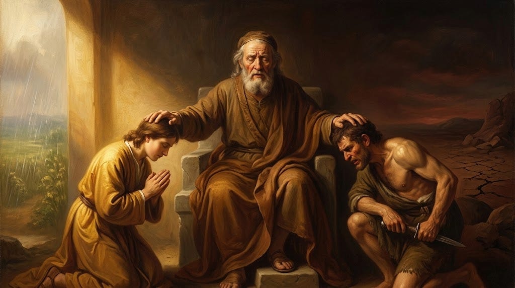 If you read the NRSV and the Septuagint, taking the “away from the fatness” reading, you get a much harder story. A story where Jacob received everything and Esau received nothing. Where Isaac, speaking under prophetic compulsion, could not bless Esau even if he wanted to. Where the words that came out of his mouth were not blessings at all, but the grim pronouncement of a future defined by barren land, the blade, and bondage.